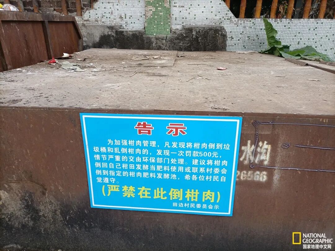 那么,如何处理是正确的?垃圾箱上的牌子写道:“建议将柑肉倒回自己柑田发酵当肥料使用,或是联系村委会倒入指定的柑肉肥料发酵池。”