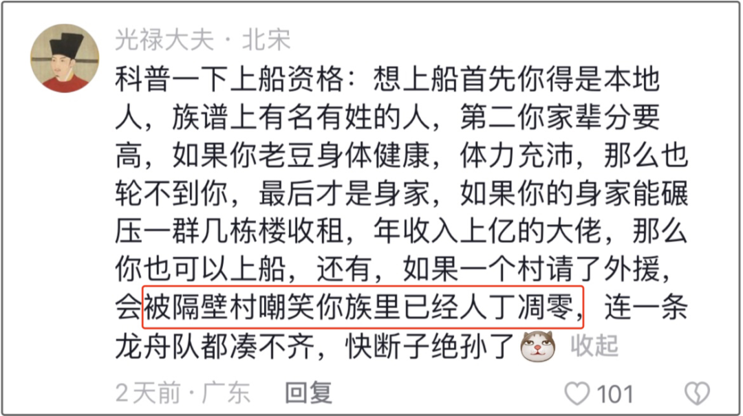 要知道,一般只有家族地位高、经验丰富的人才能代表本地参赛,所以互联网上纷纷传说:能上船的人,大概率都是坐拥几套房产的房东。