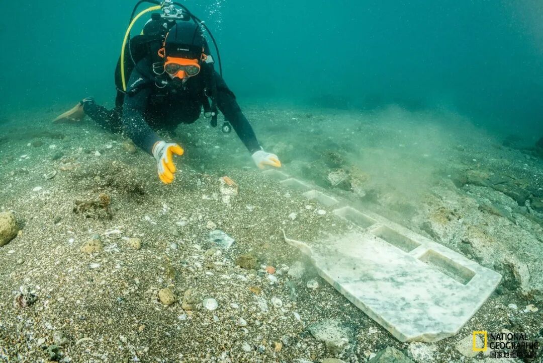 在意大利波佐利附近海底,一位考古学家正挥手清理白色大理石祭坛残骸上的沉积物。这座祭坛来自纳巴泰人建造的古代神殿,这些定居沙漠的商人凭借巨额财富建起了约旦佩特拉这样的城市。考古学家猜测,这座神殿本体大概埋在30~60厘米深的沙子下面。|MINISTERO DELLA CULTURA