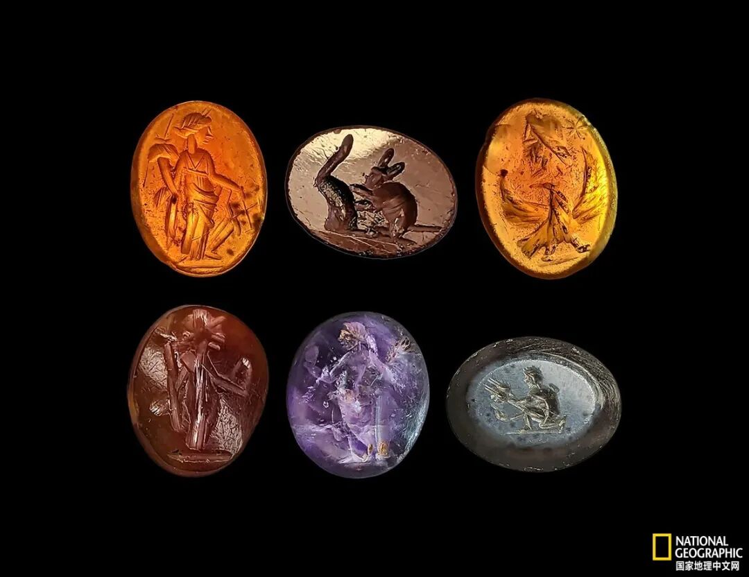 6月,考古学家公布在英国卡莱尔的古罗马人浴池遗址上找到了这些宝石。图中从左上角起,按顺时针方向分别是:一手拿着丰饶之角、一手拿着方向舵的命运女神福尔图娜,一只正在啃咬树桩的老鼠,一只展开双翼的鹰,一个正在用镰刀收割谷物的男人,一手紧握棕榈叶、一手拿着花朵或镜子的爱与美的女神维纳斯,以及装备着长矛、肩抗战利品的战神马尔斯。|ANNA GIECCO