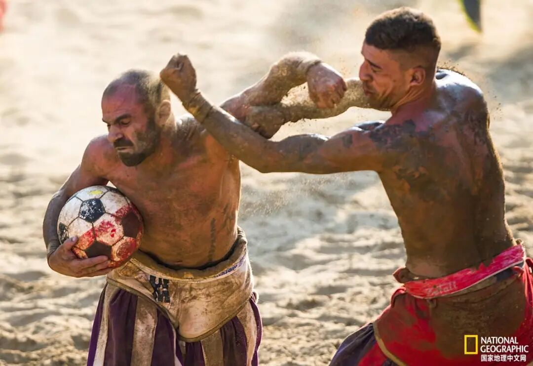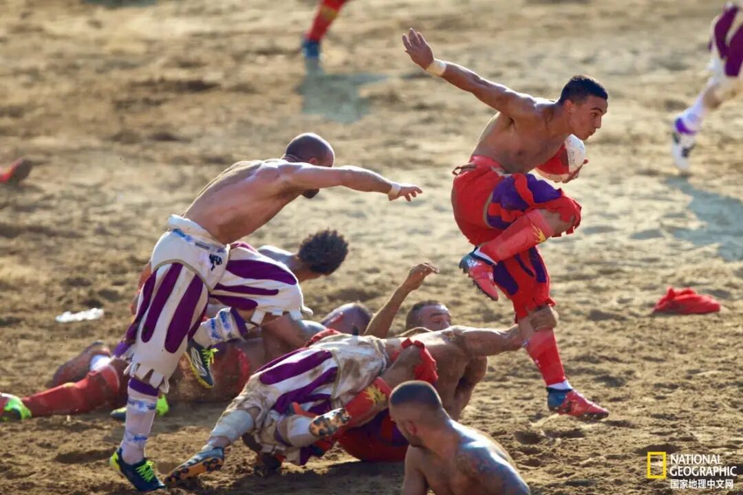 这项赛事看上去有点像橄榄球比赛,但它是在一个古老广场上的巨大沙坑里举行的,球员们穿着那个时代的服装,参赛者可以手脚并用,用任何形式阻挡对手,可以用头撞击,也可以摔跤,击打和推挤,比赛非常残酷,很容易受伤。