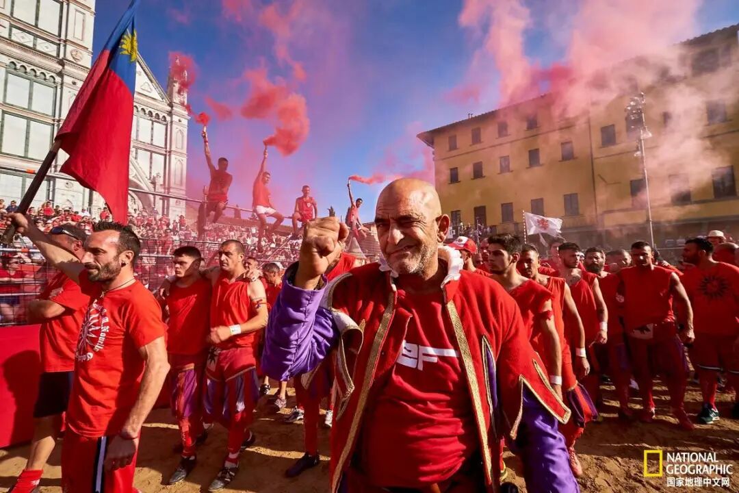 2018年古典足球半决赛,罗西队成员将前往比赛现场。当地人认为参加古典足球比赛是一种莫大的荣耀。“就算你带走我的直系亲属,那我还有‘古典足球’,”面包师Niccolò Innocenti说道,他已经在球队效力多年了。|MASSIMILIANO DONATI, AWAKENING/GETTY IMAGES