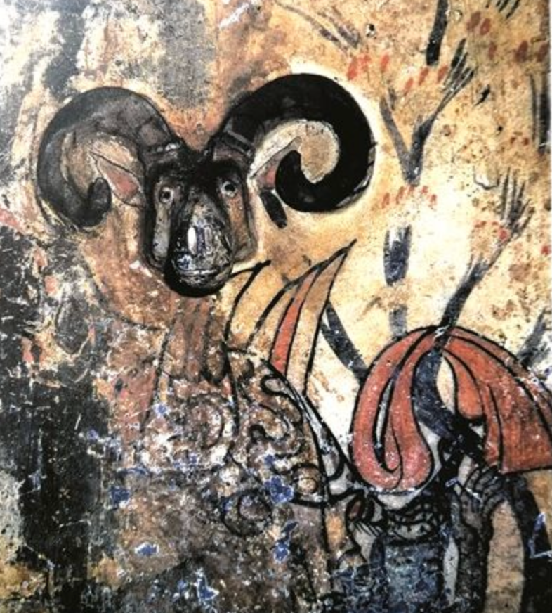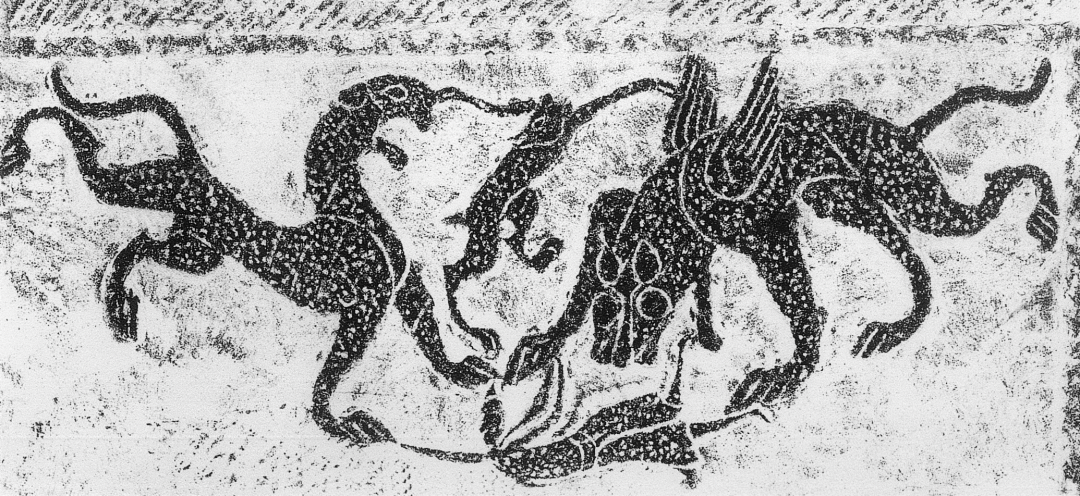 洛阳烧沟61号西汉壁画墓:整幅壁画的左边漫漶,右边有一株树,树下有一长双翼的猛虎按住一个裸女,做挣扎状。画面偏上处,有一高浮雕羊头。|洛阳晚报