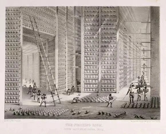 贸易也带来了毁灭。一幅名为《印度巴特那的鸦片工厂忙碌的堆放室》或可解释一二。英国东印度公司在印度生产专门出口到中国的鸦片,其中巴特那是最受市场认可的牌子。
