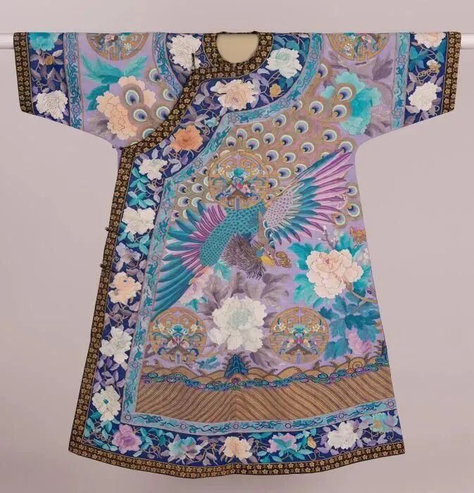 慈禧的这件长袍融合了日本明治时期 (1868-1912) 的和服设计,上有盘旋向下的孔雀尾凤凰。从19世纪70年代开始,新的欧洲苯胺染料扩大了可用的颜色。
