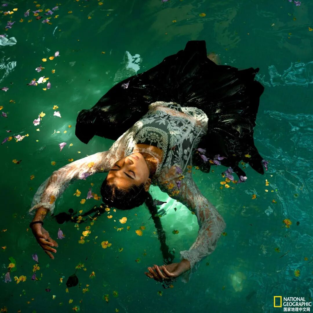 Ellinor Buitrago Méndez身穿波莱拉裙在水中漂浮,周身布满鲜花。