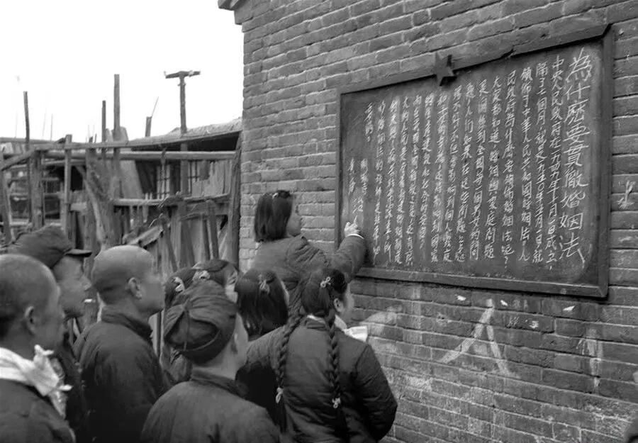 20世纪50年代初,北京市基层干部在街头书写宣传婚姻法的板报。|新华社
