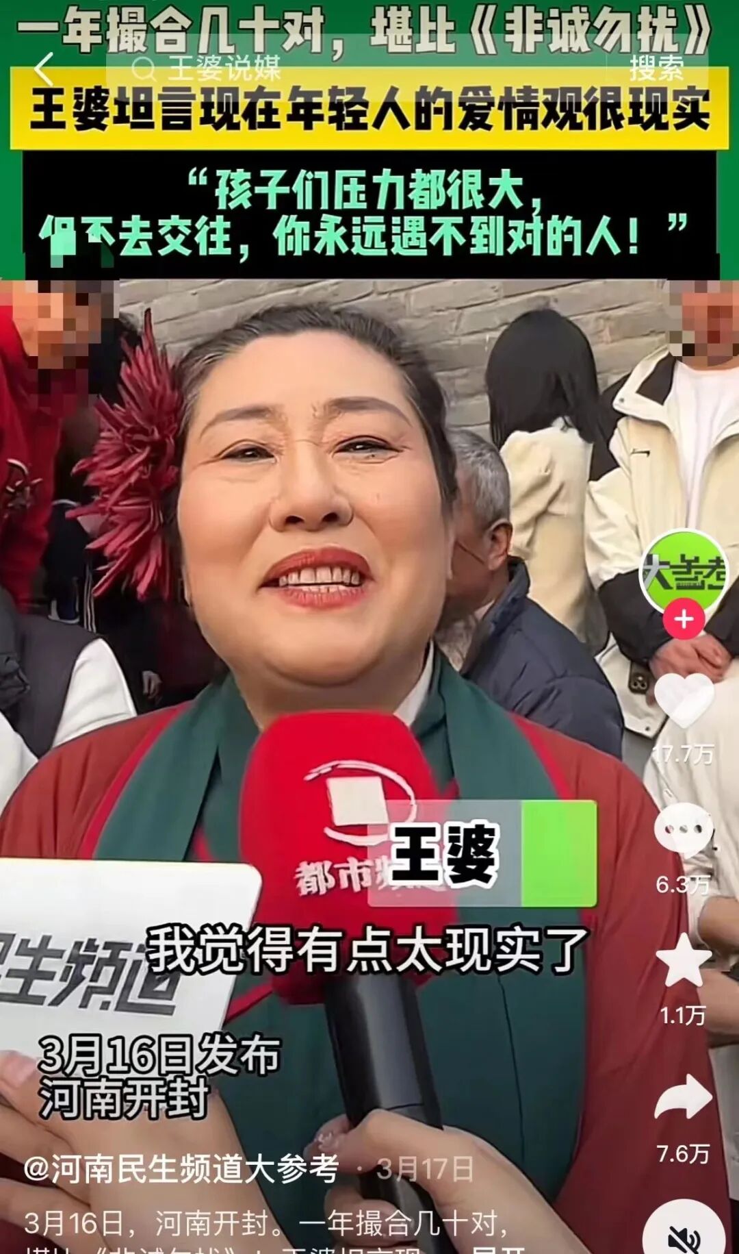 据统计,“王婆说媒”等抖音话题的累计播放量已超60亿次,由她组织的500人相亲群也加满了5个。现场观众说:“上场名额太少了,要是多几个‘王婆’就更好了。”