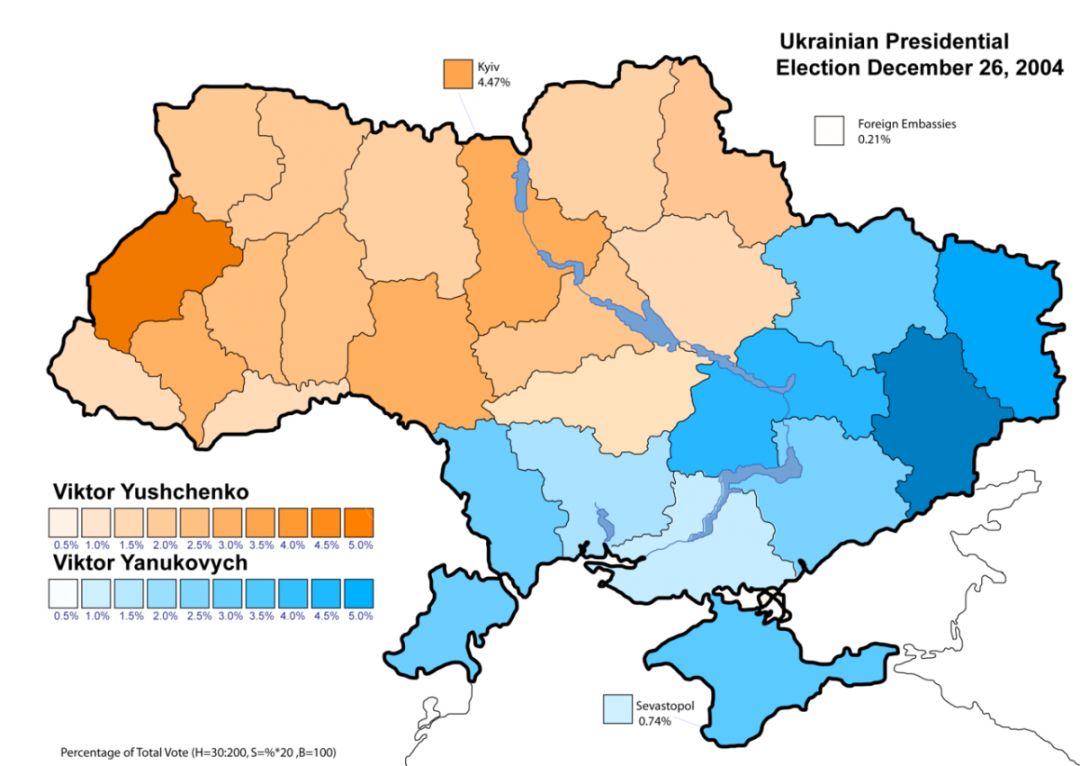 ▲2004年年末乌克兰二次重选票数分布图,橙色代表尤先科,蓝色代表亚努科维奇。次年成功入职总统,“橙色革命”的最后,以尤先科的胜利而收场