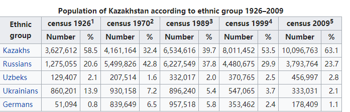 ▲哈萨克斯坦1926-2009年的民族人口比例(从上到下分别是哈萨克族、俄罗斯族、乌兹别克族、乌克兰族、德意志人)