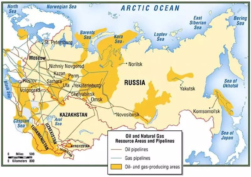 ▲俄罗斯主要油气产地和运输管道