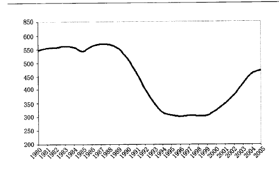 ▲1980—2005年俄罗斯原油生产规模变化(单位:百万吨)