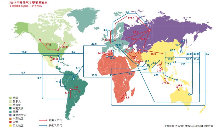 ▲2018年天然气主要贸易流向(来源:BP2019《世界能源统计年鉴》)