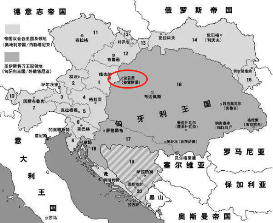 ▲奥匈帝国地图,其中波佐尼(普雷斯堡)划给匈牙利王国
