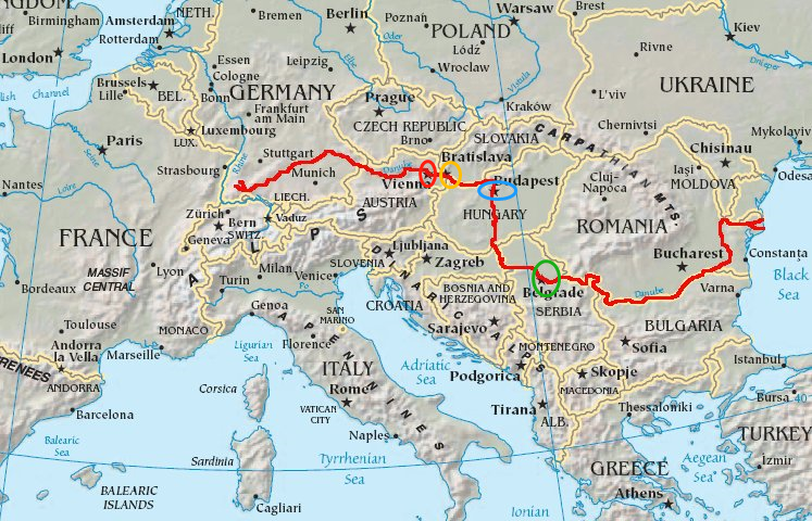 ▲多瑙河流域示意图,包括众多沿岸国家的首都(维也纳,布拉迪斯拉发,布达佩斯和贝尔格莱德)都在河流沿岸