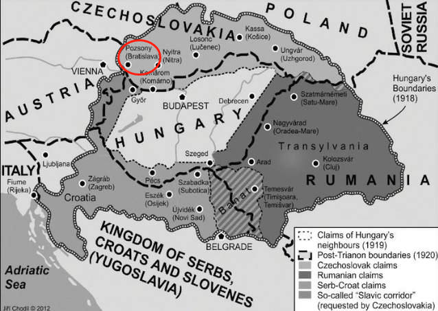 ▲《特里亚农条约》匈牙利丧失三分之二领土。波佐尼(红色)划给捷克斯洛伐克