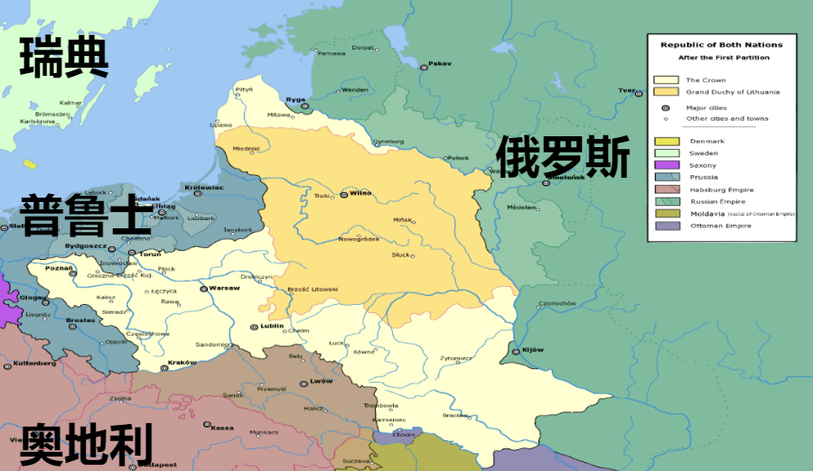 ▲深黄色为1772年遭到瓜分后的波兰立陶宛联邦疆域