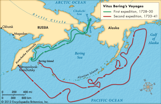 然而俄国人并不满足于此,不顾北极圈的天寒地冻,还要继续前进。1728年,受雇于俄海军的丹麦人维塔斯·白令率北极探险队抵达了亚洲与美洲之间的狭窄海峡。而这个海峡,日后也以他的名字命名为“白令海峡”。