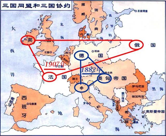 1871年普法战争后,普鲁士统一了德意志,发展势头迅猛,很快超过英国。1904年,英法两国为了遏制新生德国的扩张而组成协约国集团,德国便拉拢同为日耳曼人主导的奥匈帝国成立同盟国作为对抗。