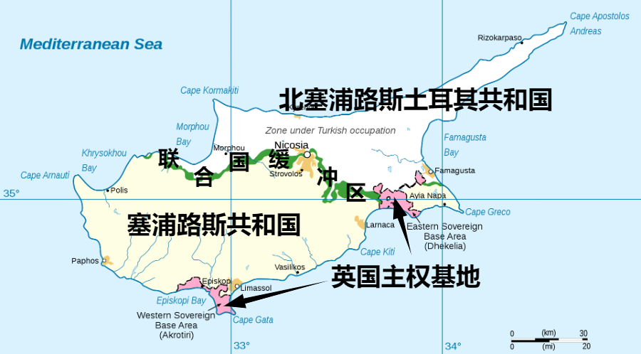 更奇怪的是,两个政权中间还存在联合国缓冲区,由联合国维和部队维持。岛上还有3%的土地被英国控制,英国在岛上建立了两个军事基地。