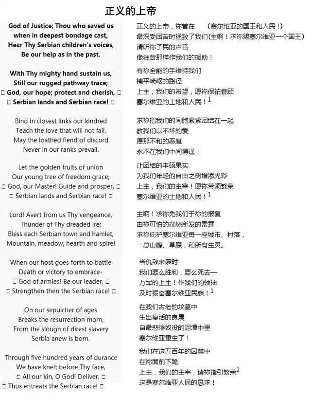 ▲塞族共和国沿用了原塞尔维亚国歌《正义的上帝》,括号内是有关国王的头两句原词,1992年时被改掉