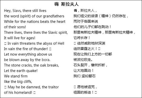 1919年那首国歌的歌词,由于有歌颂国王和宗教的内容。作为社会主义国家,南斯拉夫便改用了“泛斯拉夫主义”强烈的《嗨,斯拉夫人》作为国歌。