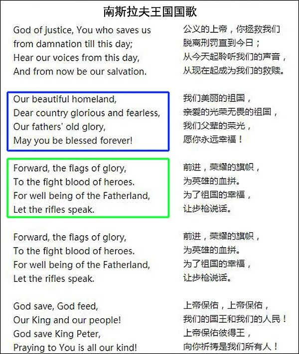 ▲《南斯拉夫王国国歌》的歌词,蓝框中源自克罗地亚国歌,绿框中源自斯洛文尼亚国歌