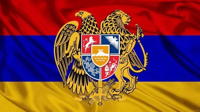 ▲亚美尼亚国徽,背景为国旗