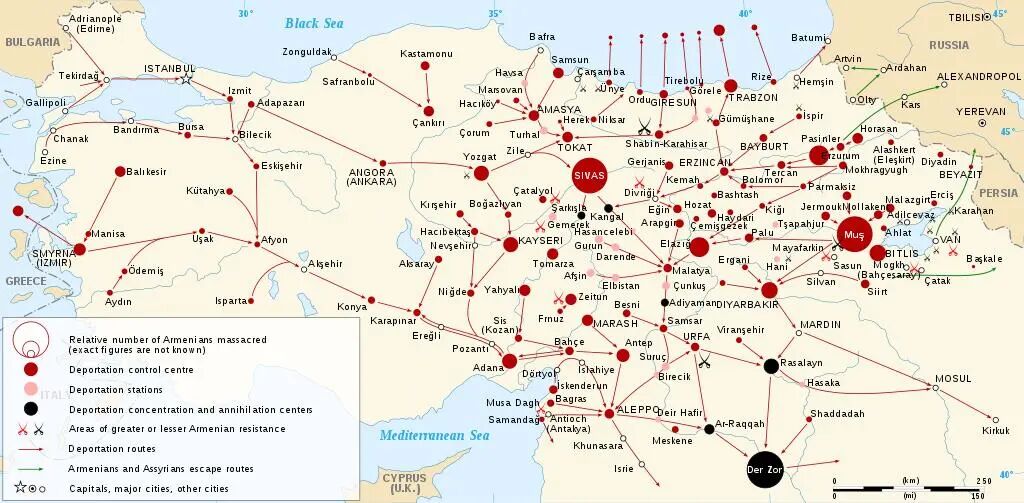 随着奥斯曼帝国在战争中处于被动局面,奥斯曼统治者把战败的罪责推到亚美尼亚人身上,认为他们“勾结”了外部势力。1915年,奥斯曼帝国通过《特尔西法案》,允许军队驱逐“危害国家安全的人”,对境内的亚美尼亚人进行有计划的种族灭绝。短短的两年时间内,大约150万亚美尼亚人被害。