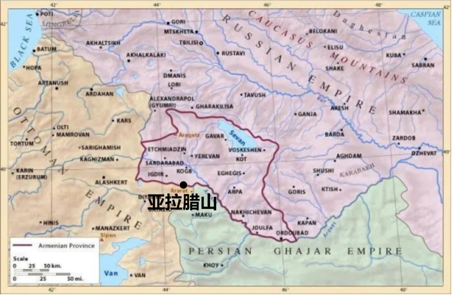 ▲俄国占领的亚美尼亚(红线内),亚拉腊山属于界山