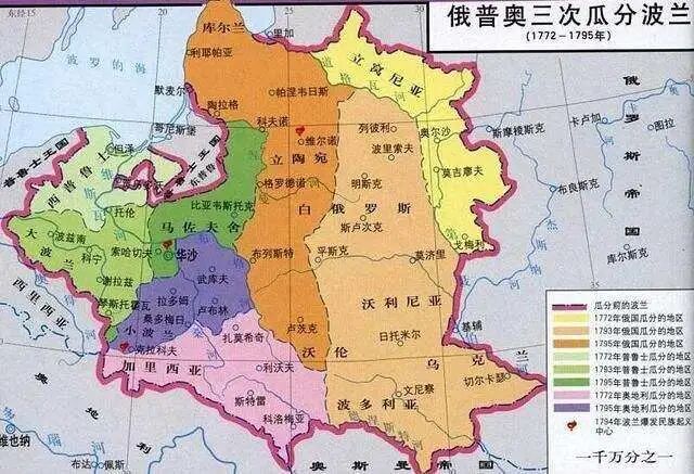 ▲1772~1795年间俄普奥瓜分波兰