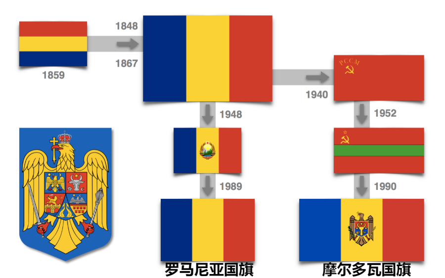 摩尔多瓦的国旗底色与罗马尼亚国旗一致,国歌直接选用罗马尼亚国歌《醒来吧,罗马尼亚人》,甚至在摩尔多瓦最早的一版宪法中,国家语言被明确为“罗马尼亚语”。