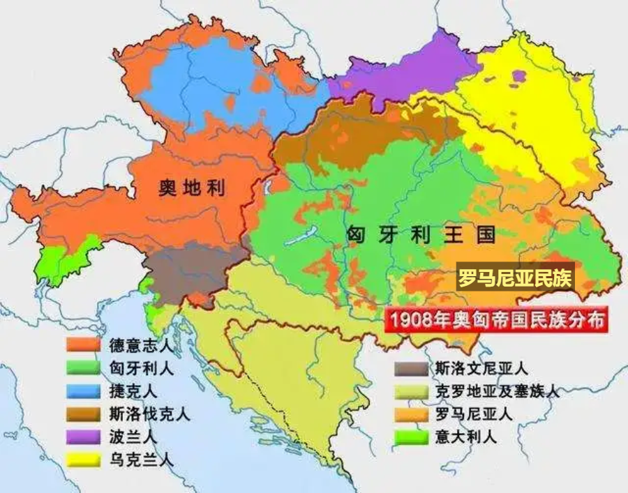 ▲奥匈帝国民族分布,罗马尼亚人广泛分布于匈牙利的东边