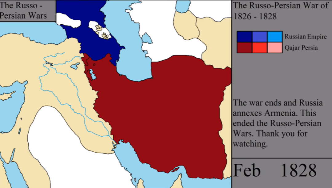 为了夺取高加索地区和里海,沙俄和波斯爆发了“俄波战争”。实力孱弱的波斯帝国无力抗争,与沙俄签订《古利斯坦条约》(1813)和《土克曼恰伊条约》(1825),被迫将东亚美尼亚地区和北阿塞拜疆地区(今阿塞拜疆的国家雏形)割让给沙俄。
