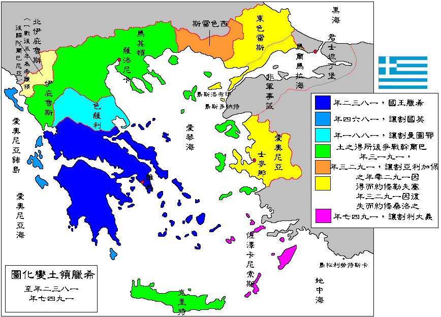 ▲希腊国土扩大(黄色为占领后失去的),不包括塞浦路斯岛