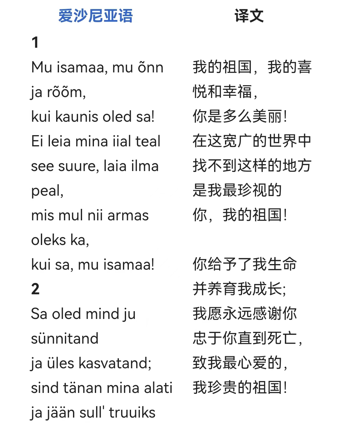 芬兰国歌《我们的国家》和爱沙尼亚国歌《我的土地,我的欢愉》歌词不同,但曲调却是一样的。这是国歌世界上少有的“共享旋律”现象。