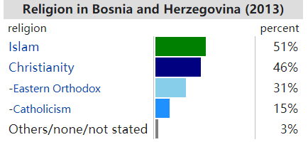 ▲波黑2013年的宗教成分,伊斯兰占51%,东正教占31%,天主教占15%