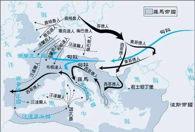 巧合的是,就在北匈奴消失后不久,欧亚大陆上出现了一次民族大迁徙。来自亚洲的多个游牧民族先后向西迁移,带动沿途更多的民族涌向欧洲腹地,其中的日耳曼人灭亡了西罗马帝国。