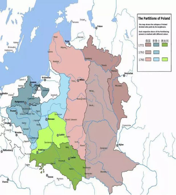 ▲俄普奥三次瓜分波兰地区示意图,其中,蓝色部分为普鲁士瓜分的。格但斯克划给普鲁士,并改名为但泽