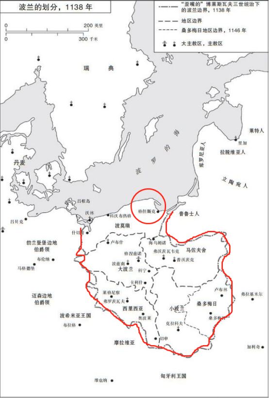 ▲公元1138年波兰地图(红色部分),其中格但斯克(红色圈)划给波莫瑞地区
