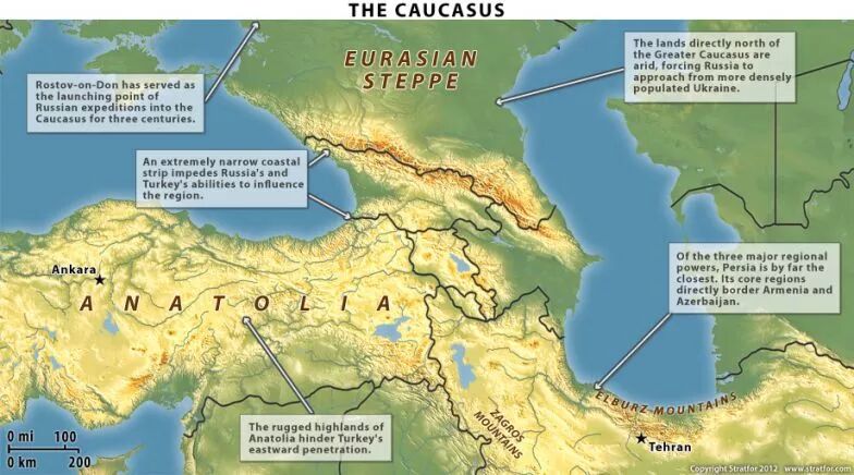 外高加索地区位于欧亚大陆的心脏地带,是由阿塞拜疆、亚美尼亚、格鲁吉亚三个国家组成的。由于地处高加索山脉的南侧,所以他刚好也处在欧亚两洲的分界线上。