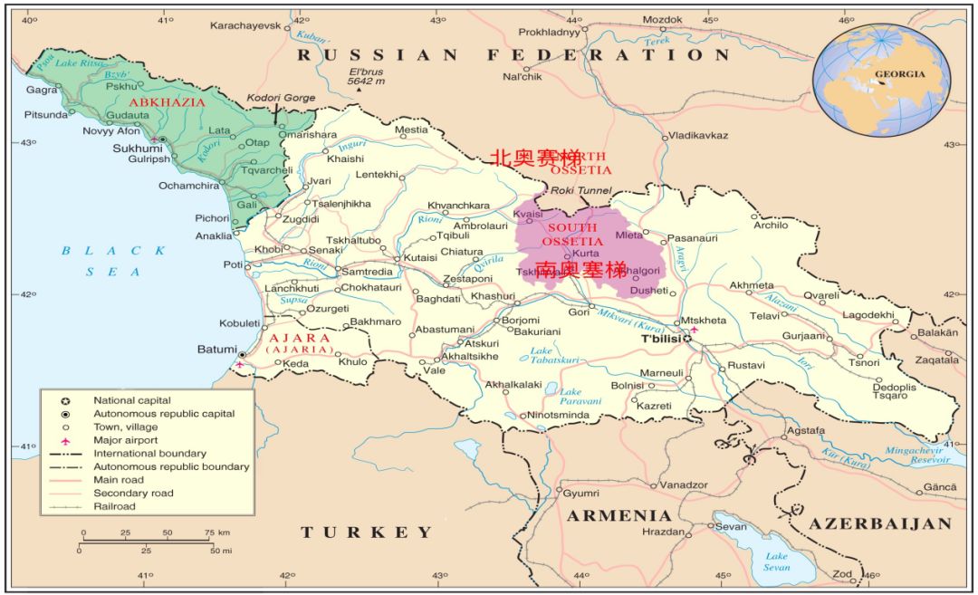 ▲阿布哈兹自治共和国及南奥塞梯共和国的地理位置,两地的“独立身份”都不被联合国承认
