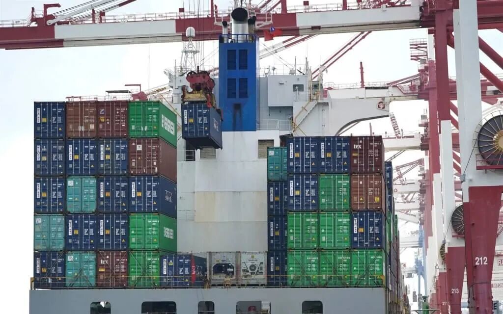 图为停靠在高雄港区的货柜船正进行装卸作业。图源:台媒
