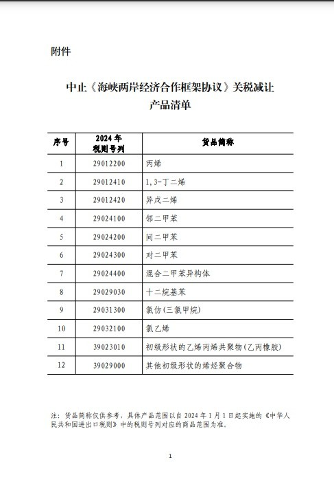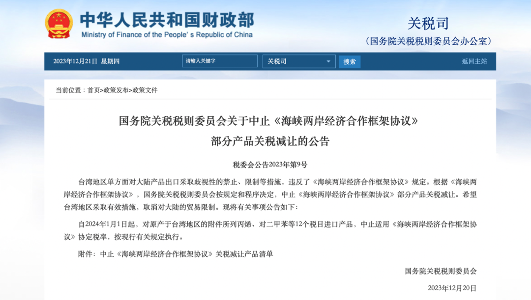 据财政部网站今天(21日)的消息,国务院关税税则委员会发布公告,决定中止《海峡两岸经济合作框架协议》(ECFA)部分产品关税减让,自2024年1月1日起,对原产于台湾地区的丙烯、对二甲苯等12个税目进口产品,中止适用ECFA协定税率,按现行有关规定执行。希望台湾地区采取有效措施,取消对大陆的贸易限制。