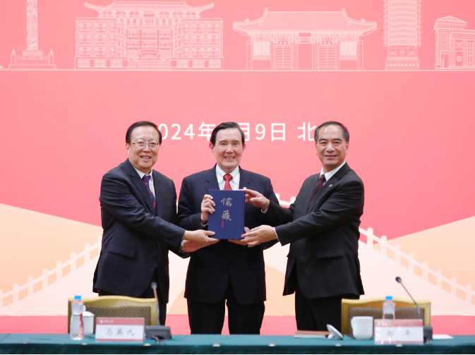随后,北京大学党委书记、校务委员会主任郝平与北京大学校长龚旗煌赠送给马英九一部《儒藏》。据了解,《儒藏》是一项重大文化学术项目,该项目于2003年启动,目标是将中国历史上重要的儒家经典进行系统地整理与汇编。马英九则回赠北京大学一本《中华语文大辞典》,据悉,该辞典是由台湾中华文化总会邀集两岸数百位学者专家合力编纂的。