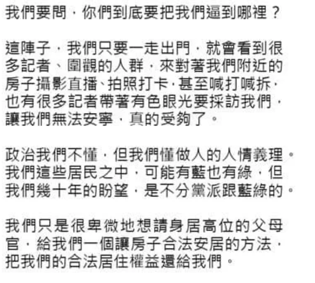 台湾《联合报》指出,新北市政府日前称,对于原有矿权废止前已存在的房子,新北市地政局从2019年起就屡屡向台当局反映要修订法规。新北市政府表示,请台当局加快脚步立即修订,市政府也一定会尽全力向台当局争取,保障当地民众的居住权益。对于“歹戏拖棚”的“赖皮寮”剧情,有岛内网民认为此“嫌恶设施”不如早日移除,还有说“拆了不就什么都没事了吗”。