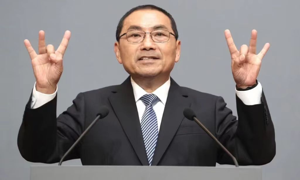 侯友宜在记者会上比出“喜乐”手势,说“你好,我好,大家都好”。图源:台湾“联合新闻网”