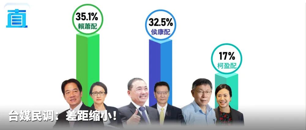 其中,亲绿媒体“美丽岛电子报”的第88波民调显示,在中间选民趋向于观望、不表态的情况下,三组候选人的支持率都略有下降。民进党候选人“赖萧配”支持度为34.7%,国民党候选人“侯康配”为31.2%,双方差距为3.5个百分点,而民众党候选人“柯盈配”则占16.8%。交叉分析比对发现,“侯康配”在“双北”(即台北市和新北市)、“桃竹竹苗”(即桃园市、新竹市、新竹县、苗栗县)的支持度都攻上第一,大本营新北市以32.7%维持领先、台北市支持度与上一次相比,上升2个百分点,来到31.5%,超车“赖萧配”。