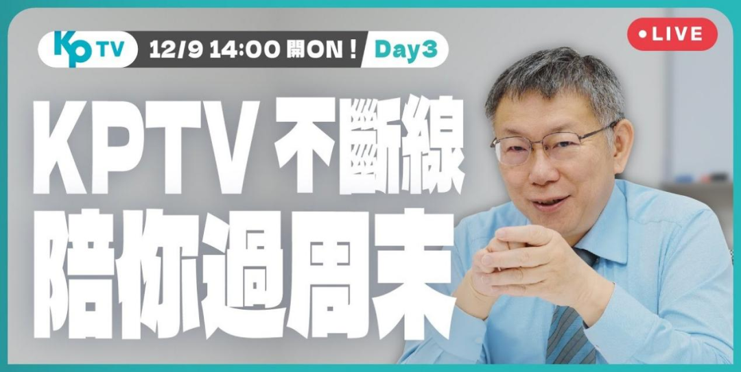 民众党柯文哲阵营自12月7日开始于油管平台开办自制节目“KPTV”,每天进行8小时直播,说未来如果操作熟练,会再逐渐延长直播的时间。柯文哲表示,台湾历史上从未有过使用连续性直播打选战的方式,但这之所以会出现,是因为他现在晚上都不敢打开电视来看,因为每台都在骂他。