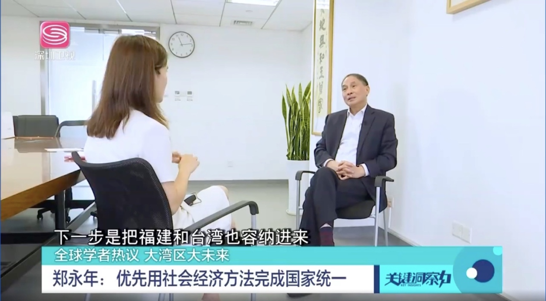 深圳卫视直新闻记者曾于2021年专访香港中文大学(深圳)校长讲座教授、全球与当代中国高等研究院院长郑永年。郑永年认为粤港澳大湾区的社会经济融合发展实践为处理台湾问题提供了很好的解方。“台湾问题也完全可以通过社会经济融合,来达到互相理解。”郑永年提出建立一个“南方共同市场”,以粤港澳大湾区为中心,把旁边两个岛包括进来,一个是海南岛,一个是台湾岛。通过这样一种社会经济的交往,转化成为一种台湾年轻人政治上认同的变化。